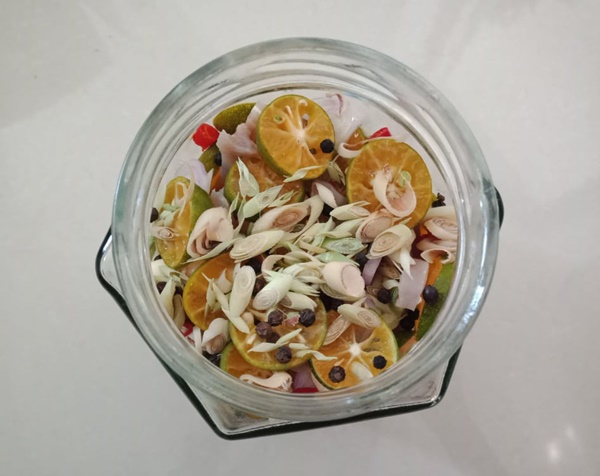 Xếp tai heo vào hũ thủy tinh rồi cho tiêu hạt, hành tím, tỏi, sả, ớt đã sơ chế lên mặt tai heo, cho tiếp tắc đã cắt lát vào trên cùng.