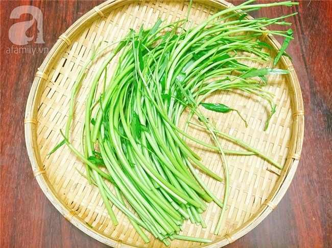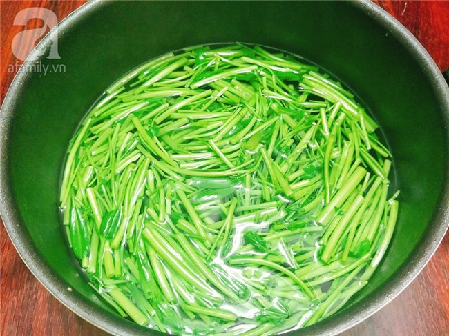 Rau muống đem nhặt sạch hết phần lá, chỉ lấy phần cọng non rồi rửa sạch vài lần với nước lạnh. Để rau ráo nước sau đó thái khúc dài.