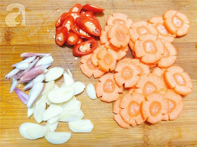 Cà rốt nạo sạch vỏ rồi khứa hình hoa sau đó thái lát mỏng. Tỏi, hành khô bóc sạch vỏ rồi thái lát, ớt sừng cũng đem thái lát mỏng (nếu không ăn cay bạn có thể bỏ qua).