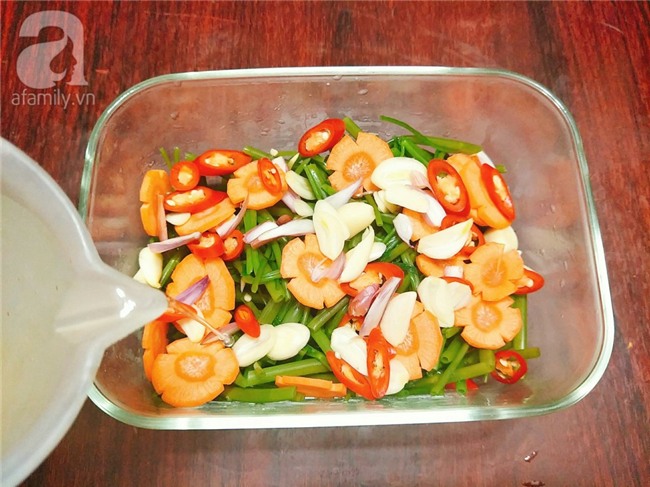 Bạn vớt rau ra để ráo sạch nước thì cho vào hũ sạch, tiếp theo cho tỏi, hành khô, ớt, cà rốt vào cùng rồi đổ nước giấm đường đã nguội vào ngập rau là được, dùng đĩa sứ chèn lên trên cho rau ngập trong nước.