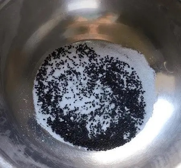 Bước 1: Bạn chuẩn bị một âu lớn, cho vừng đen và đường vào. Tiếp theo bạn thêm bột mì vào rồi trộn đều các nguyên liệu.
