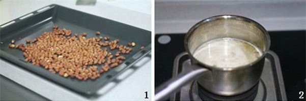 Lạc rang chín hoặc cho vào lò nướng ở 170 độ C trong 8 phút cho lạc chín. Cho đường, mạch nha, mật ong, nước và nồi đun trên lửa nhỏ, đun cho đường tan và sôi lên. Bạn đun cho sôi thêm một chút tạo thành xi rô đường. (Bạn kiểm tra siro đạt chưa bằng cách nhúng đũa vào nồi siro sau đó cho vào bát nước lạnh, nếu siro đường tạo thành viên nhỏ cứng là được).