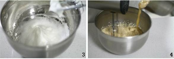 Trong lúc đun siro thì lòng trắng trứng đã để ở nhiệt độ phòng cho vào âu rồi dùng máy đánh trứng đánh bông cứng lòng trắng. Tiếp đó đổ từ từ siro đường còn nóng vào âu lòng trắng trứng và vẫn dùng máy đánh trứng đánh cho siro và lòng trắng quyện vào nhau.