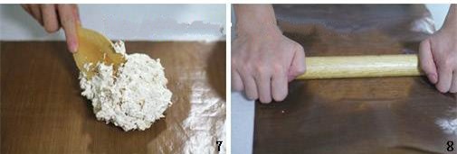Trải một miếng giấy nướng bánh xuống mặt bàn, múc nhanh kẹo lạc đã trộn lên trên miếng giấy. Đặt tiếp một miếng giấy khác lên trên rồi dùng thanh cán cán mỏng kẹo.