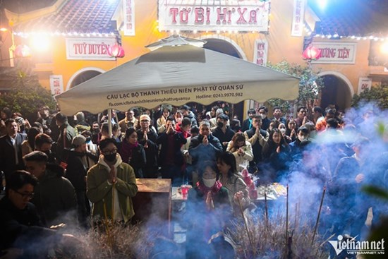 Sau thời khắc chuyển giao giữa năm cũ và năm mới, hàng trăm thanh niên và các gia đình ở Hà Nội đổ về chùa Quán Sứ, đền Quán Thánh làm lễ. Có người xin được chữ thư pháp cầu bình an ngay trong đêm.