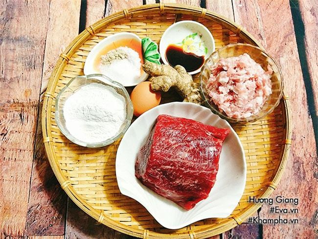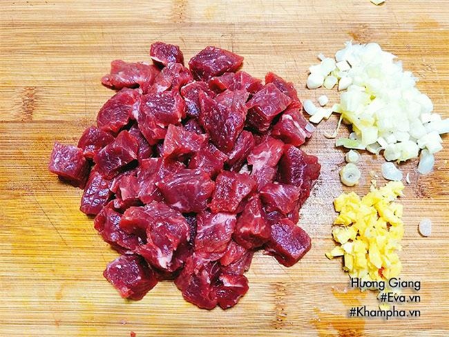 Bước 1: Thịt bò đem rửa sạch rồi dùng giấy nhà bếp thấm cho khô nước. Tiếp theo, thái thịt thành những miếng nhỏ cho dễ xay. Gốc hành trắng thái nhỏ, gừng cạo sạch vỏ rồi đập dập và băm nhỏ.