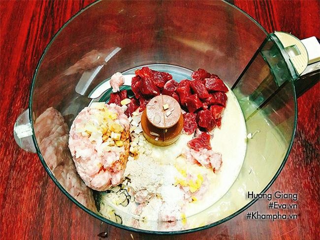 Bước 3: Cho thịt bò, thịt heo xay, gừng, gốc hành trắng vào cối xay thịt sau đó đổ bát bột vừa trộn vào cùng rồi thêm muối, nước tương, tiêu, đường, hạt nêm.