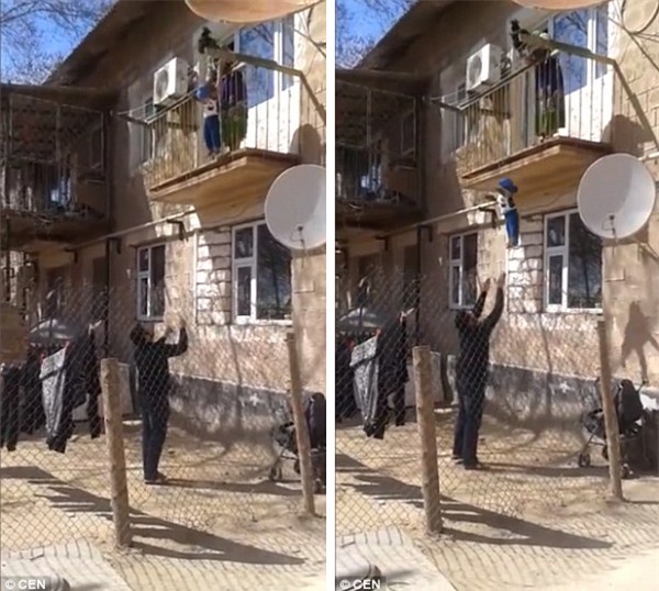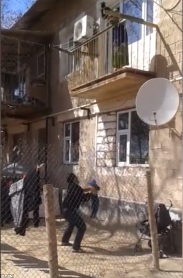 Bà mẹ người Kazakhstan này vì ngại đi cầu thang đã thản nhiên thả cậu con trai 18 tháng tuổi từ ban công xuống để bố đứa bé ở dưới bắt lấy.