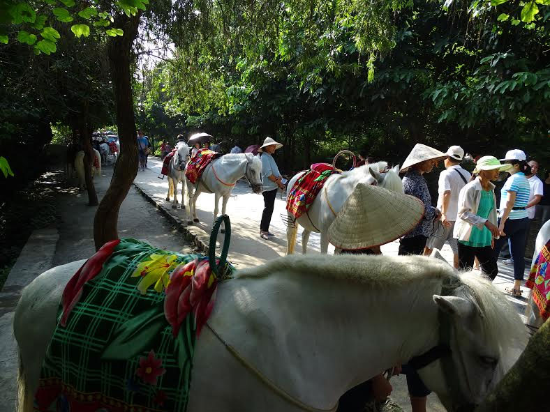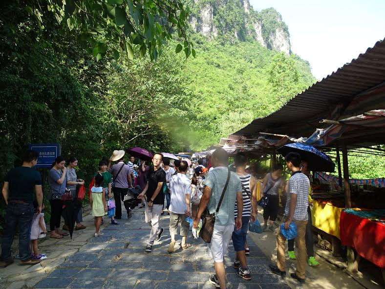 Khác với phía Việt Nam, dịch vụ du lịch ở bên phía biên giới Trung Quốc kinh doanh có vẻ bài bản hơn khi họ có cả xe điện phục vụ du khách đi lại và cả dịch vụ cho thuê ngựa cưỡi dạo chơi. Du khách Trung Quốc đông vô kể, người ta chen nhau trên lối đi và cả khi qua một vài cây cầu. Nếu trước đó, chúng tôi chỉ cần đi bộ khoảng 10 phút là đã tới gần chân thác thì lúc này, bên phía biên giới Trung Quốc, chúng tôi cùng du khách Trung Quốc phải leo lên nhiều bậc thang cao để “mục sở thị” khiến ai nấy cũng phải thở hổn hển. Thực ra cảnh thác Bản Giốc nhìn từ Trung Quốc không đẹp bằng nhìn từ phía Việt Nam, cho dù có lợi thế quan sát từ trên cao. Dưới đất, cạnh mặt hồ có vài điểm dịch vụ chụp ảnh lấy ngay với giá10 nhân dân tệ cho một bức ảnh, nhiều du khách phải xếp hàng chờ tới lượt.