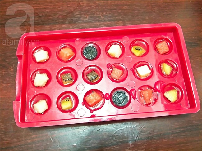 Múc từng muôi thạch đổ đầy 1/2 khuôn sau đó cho từng viên hoa quả vào khuôn thạch, tiếp tục đổ thạch cho đầy khuôn và đậy nắp khuôn còn lại lên trên, để cho thạch nguội bớt và đem cất ngăn mát tủ lạnh cho thạch đông lại.