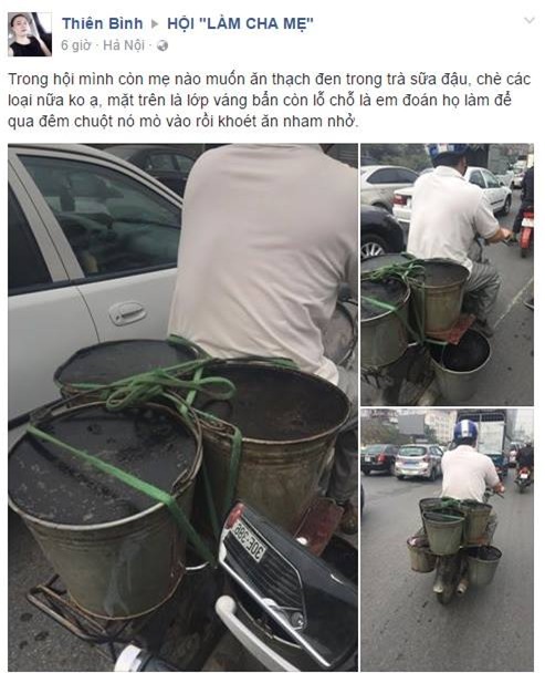 Trên group Hội làm cha mẹ, một thành viên có tên Thiên Bình chia sẻ việc bất chợt “bắt quả tang” người đàn ông vận chuyển thạch đen đến các cơ sở bán lẻ. Vấn đề ở chỗ, thạch đen được đựng trong 5 xô sắt mà nhìn chẳng khác nào… xô nước thải. Chủ tài khoản này còn mạnh dạn nhận định “bị chuột mò vào khoét ăn nham nhở” khi trên bề mặt xô nước đen nổi váng ấy là những vết loang lổ. 5 xô thạch đen bám đầy cáu bẩn, chở trên đường bụi bẩn mà chẳng hề được che đậy hay các biện pháp vệ sinh an toàn thực phẩm khác.