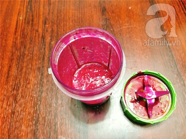 Thanh long đỏ lột vỏ rồi thái miếng vừa nhỏ, cho vào máy xay sinh tố xay nhuyễn sau đó lọc lấy nước cốt thanh long.