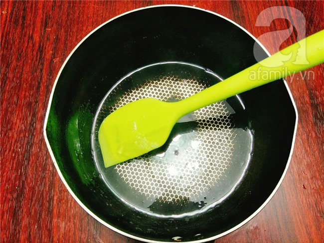 Đường và bột rau câu cho vào bát trộn đều lên. Cho nước vào nồi đun sôi sau đó cho đường rau câu vào khuấy đều cho tan, nấu cho rau câu trong lại là tắt bếp.