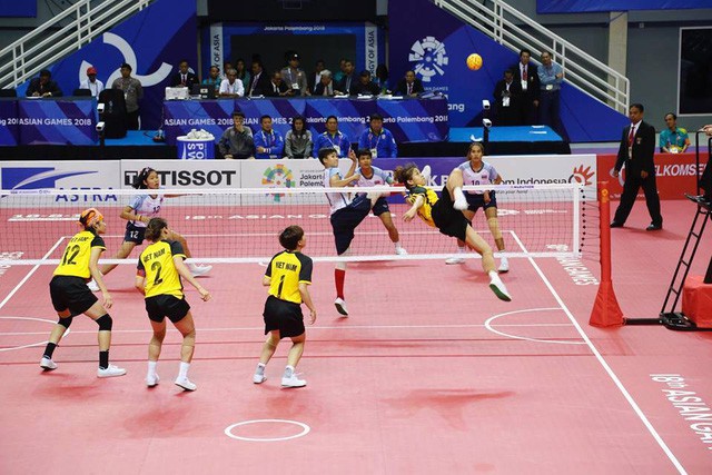 Đội tuyển cầu mây 4 người nữ của Thái Lan (trắng) giành HCV Asiad 2018 sau khi thắng Việt Nam ở chung kết