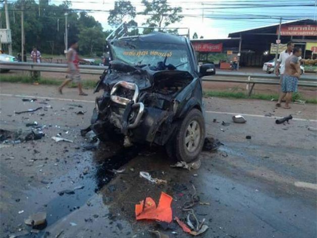 Vụ tai nạn nghiêm trọng xảy ra giữa xe khách 16 chỗ và xe bán tải tại tỉnh Sakeo, Thái Lan.
