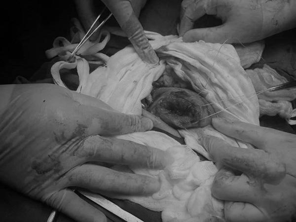 Các bác sĩ đang xử lý vết vỡ tử cung cho sản phụ.