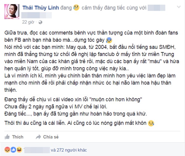 "Những ai là fan chân chính hoặc fan có suy nghĩ, có học hành, những fan có độ chín chắn nhất định, các trưởng FC hoặc người quản lý fan của Mỹ Tâm, hãy họp bàn lại và đưa ra phương án chấn chỉnh lại đội ngũ fan non dại nói trên. Hãy để hình ảnh của Mỹ Tâm đẹp gắn liền với FC đẹp như nhiều năm qua các bạn đã gây dựng và giữ gìn. Sai thì nhận, thần tượng hay bố mẹ, ai cũng có lúc sai nên chẳng có gì phải giãy nảy lên cãi vã chửi bới làm gì. Thiết nghĩ đó là cách hành xử văn minh và công bằng", Thái Thùy Linh mong mỏi.