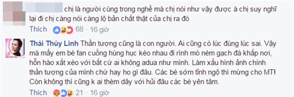 Thái Thùy Linh cũng tỏ ra giận dữ khi những fan cuồng, luôn bất chấp để bảo vệ Mỹ Tâm đang hung hãn gây chiến trên mạng xã hội...