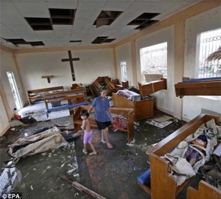 Những xác người trong một nhà thờ ở Tacloban. Ảnh: EPA. |