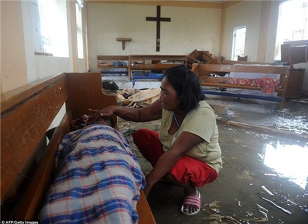 Người mẹ khóc bên cạnh thi hài của con trai trong một nhà thờ ngập nước ở Tacloban. Nhiều nạn nhân xâu số trôi theo dòng nước. Ảnh: AP. |