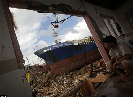 Một con tàu chở hàng dạt sâu vào đất liền do lực đẩy của sóng lớn tại Tacloban. Hình ảnh những con tàu lớn nằm sâu trong đất liền gợi nhớ thảm họa kép xảy ra tháng 3/2011 trên đất Nhật Bản. Ảnh: EPA. |