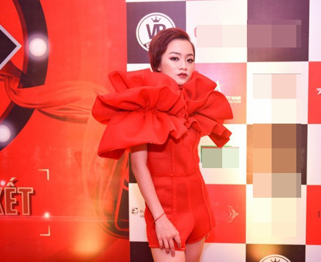 Chân dài Huỳnh Tiên với gương mặt đơ cứng bóng loáng chẳng kém gì chiếc áo kim sa mà cô đang mặc. Lấp lánh chói lóa là thế nhưng cũng khó có thể khen đây là một trang phục đẹp.