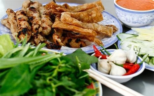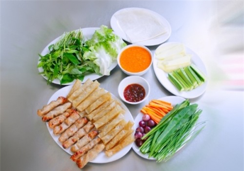 cùng. Chỉ cần đặt lên miếng bánh tráng ít rau sống, nem nướng, ống bánh