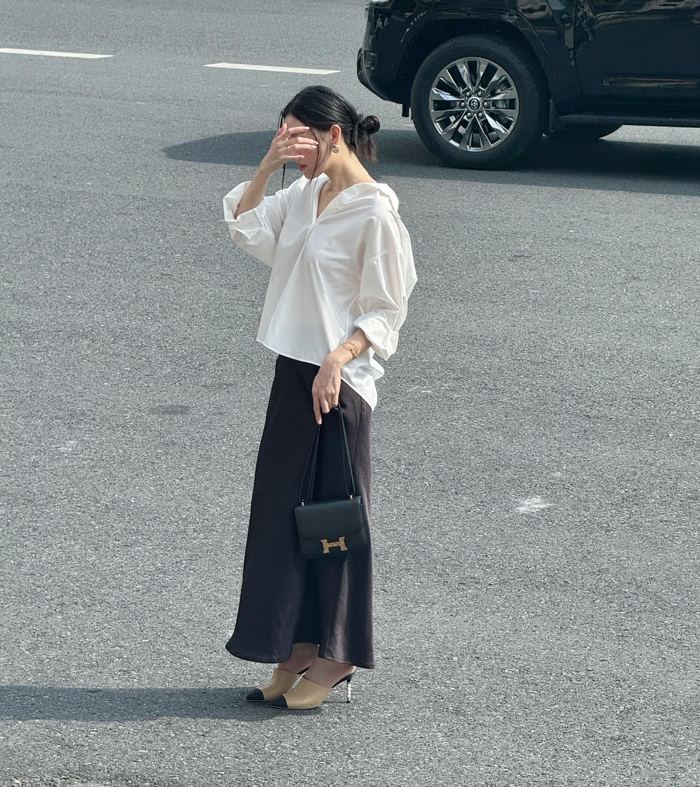 Áo sơ mi và chân váy cùng tông màu đen đã tạo nên bộ trang phục rất sang trọng. Dẫu vậy, outfit này lại không cộng tuổi cho người diện. Chưa kể, trang phục toàn màu đen còn giúp thu gọn vóc dáng hiệu quả, ai cũng có thể mặc đẹp. Công thức tươi tắn và quyến rũ hơn so với set áo sơ mi + chân váy suông chính là áo crop top + chân váy lụa và khăn họa tiết quàng vai.