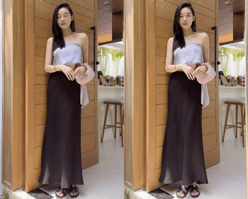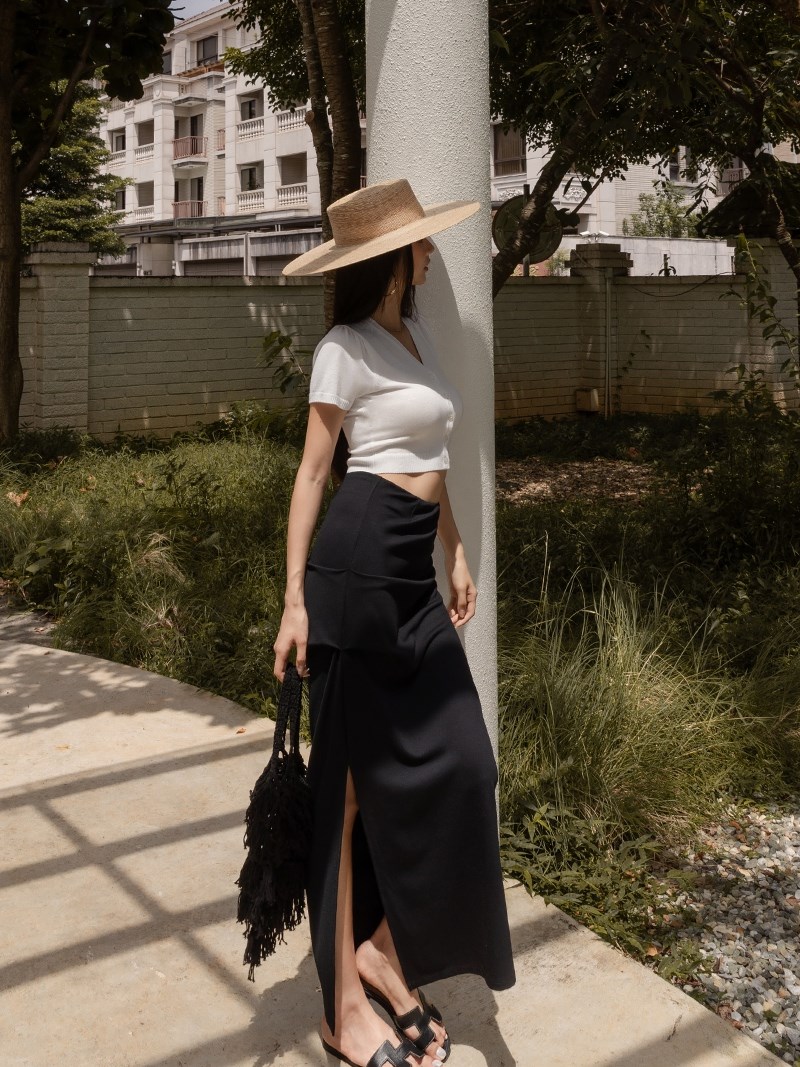 Dù rất đơn giản, outfit gồm áo crop top trắng và chân váy lụa đen vẫn rất nổi bật. Công thức này nữ tính nhưng không kém phần bay bổng, sang xịn mịn. Để hoàn thiện bộ cánh đúng chất đi du lịch, chị em nên tô điểm mũ cói, khuyên tai tròn và đi dép lê.