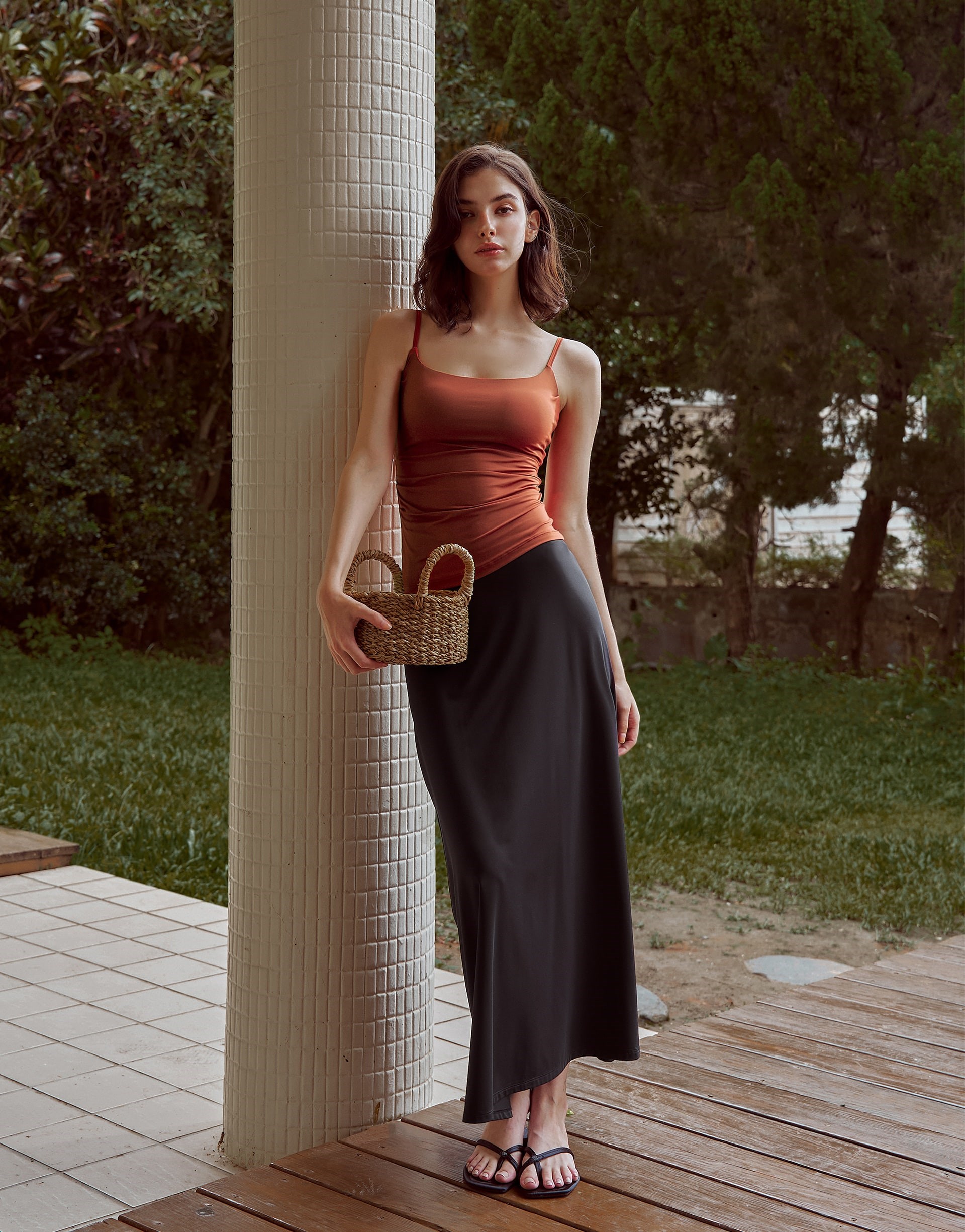 Lấy cảm hứng từ phong cách của Á hậu Tường San, chị em có nhiều công thức diện chân váy lụa sành điệu. Áo tank top màu cam đất mang đến nét trẻ trung, nổi bật cho người diện. Khi kết hợp item này với chân váy lụa màu đen, tổng thể trang phục sẽ có sự hài hòa, sang trọng. Để đảm bảo nét tinh tế cho outfit, chị em nên chọn sandal mang tông màu trung tính.
