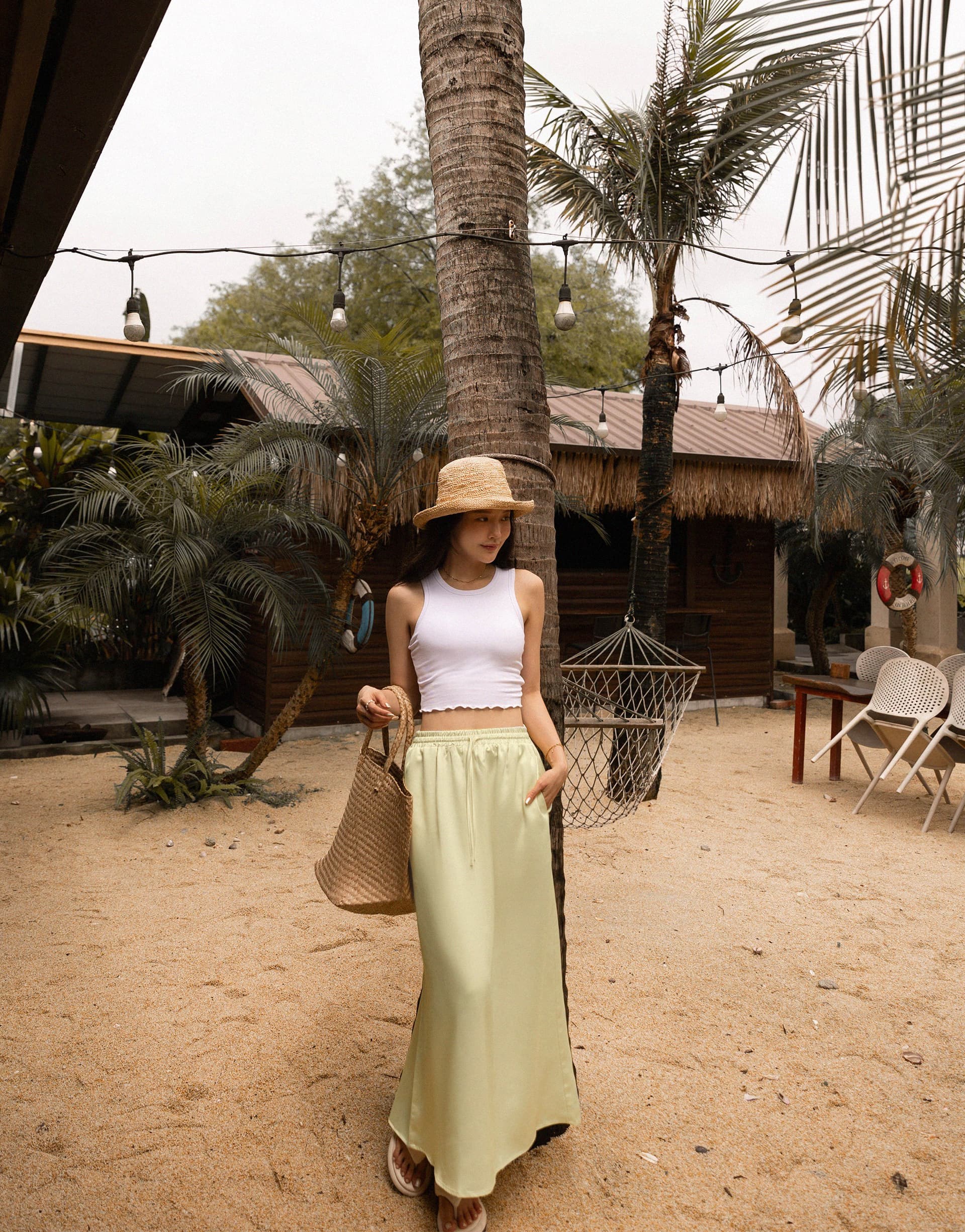 Bên cạnh chân váy lụa màu trung tính, chị em đừng bỏ qua phiên bản tông màu xanh lá nhạt. Item này rất dịu dàng và mát mắt. Chân váy xanh lá nhạt kết hợp ăn ý với áo crop top trắng để tạo nên tổng thể trang phục trẻ trung, tươi mới mà vẫn tinh tế. Các món đồ như mũ cói, túi cói rất phù hợp với outfit bay bổng.