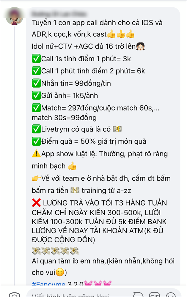 Trong các hội nhóm này, các tài khoản thường xuyên đăng tuyển cô gái hoặc người mẫu phát trực tiếp với những yêu cầu cơ bản về độ tuổi, ngoại hình... kèm theo đó là mức lương công khai theo giờ.