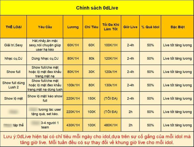 Theo tìm hiểu, mức lương của các idol livestream được trả dao động từ 60.000 đồng - 480.000 đồng/giờ tuỳ theo từng cấp độ show. Được biết, nếu các idol sẵn sàng livestream quan hệ tình dục tập thể thì mức lương sẽ trong khoảng từ 430.000 - 480.000 đồng/giờ. Bên cạnh mức lương "cứng", các idol livestream còn có thêm hoa hồng, các khoản phụ thu tuỳ vào độ chăm chỉ và khéo miệng gạ được người xem "bonus" thêm tiền. Như vậy có thể thấy, các app livestream hiện đang được xem như một miếng bánh hấp dẫn khá nhiều cô gái tham gia với nguồn thu nhập từ 500.000 đồng - 1 triệu đồng/ngày. Thế nhưng kéo theo đó cũng có khá nhiều hệ luỵ khi hình ảnh, video này có nguy cơ sẽ bị phát tán lên các web đen.