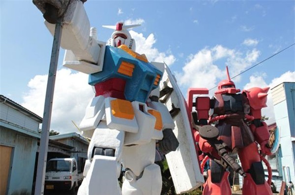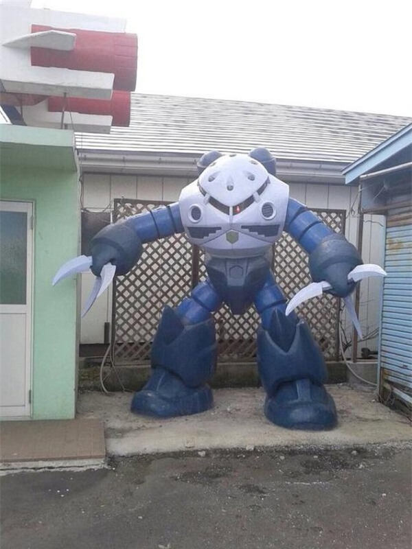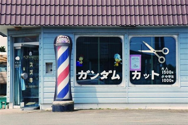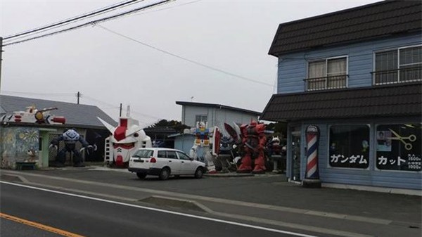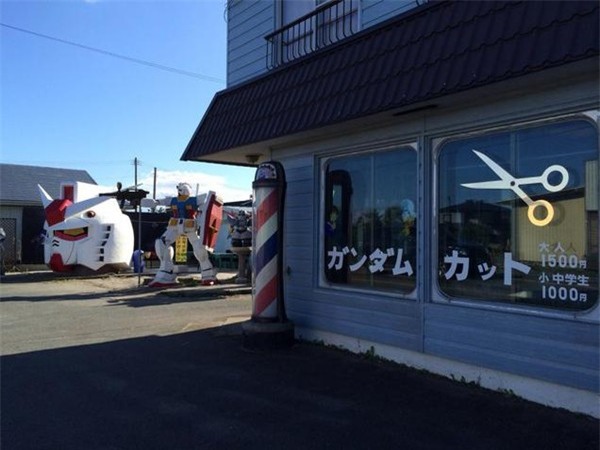 Bạn có thể thấy hàng chữ "ガンダム カット" trên cửa có nghĩa đen là Gundam Cut (Cắt tóc Gundam). Đây là một hiệu cắt tóc mang phong cách Gundam ở quận Aomori, phía Tây Bắc Nhật Bản. Sở dĩ, cửa tiệm có cái tên này ông chủ Suzuki của cửa hàng là một người hâm mộ nhiệt thành của Gundam. Chính anh là người đã tạc các mô hình Gundam trước cửa tiệm.
