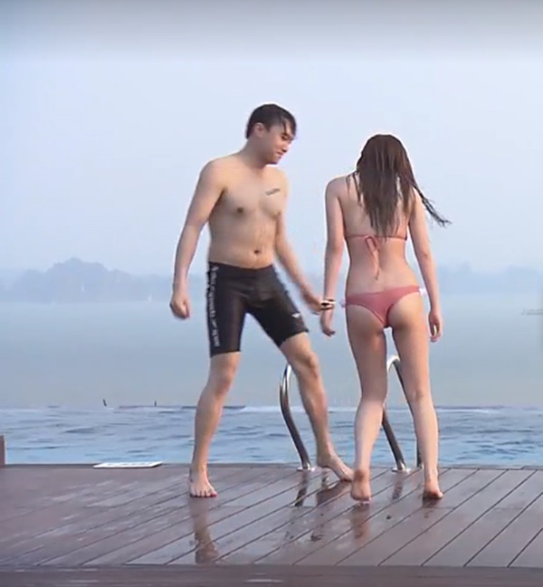 Từ lúc xuất hiện ở bể bơi, cởi bỏ áo khoác, khởi động rồi xuống tắm, cô gái này làm Vũ "Sở Khanh" đắm đuối, tỏ ý muốn tán tỉnh.