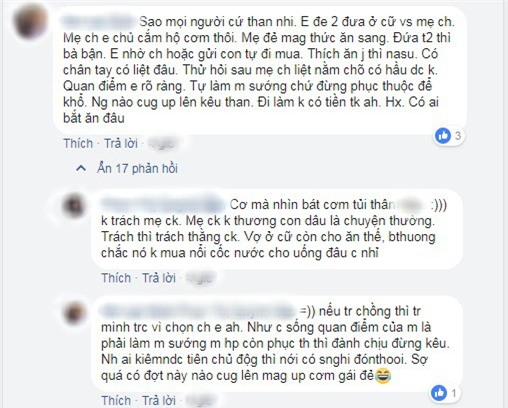 Vì lẽ đó, song song với những ý kiến chỉ trích T.B, cũng có khá nhiều người nói anh chồng rằng mang cơm về cho vợ mà vô tâm, lại chỉ có chút cơm cháy với giò, trong khi mình thì đã ăn uống no say. Bạn Huyền Trang bình luận: "Thật ra cơm này không phải là không ngon nhưng nhìn bị chán và nhạt nhẽo ấy các mẹ ạ. Làm chồng thì cũng nên để ý tới vợ một chút chứ đừng vô tâm quá như vậy".