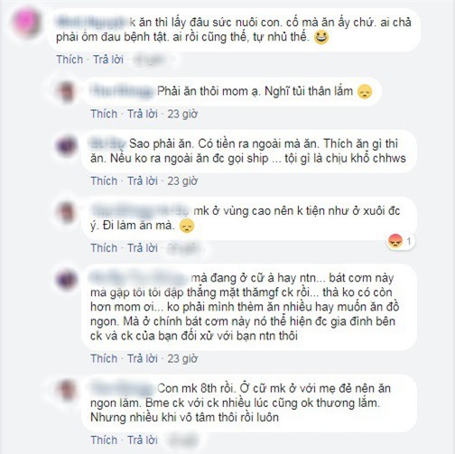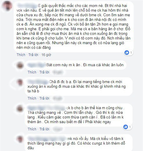 Như mẹ trẻ T.B dưới đây là một ví dụ nhé, mẹ ấy đăng hình ảnh một bát cơm trắng có miếng giò và nói rằng đó là do chồng mang về từ nhà bố mẹ chồng cho. Cô ấy không thích bữa ăn đó và cho rằng chồng mình quá vô tâm. Các chị em khác trong hội thì lần này thay vì bênh vực thì lại trở nên nghiêm khắc hơn.