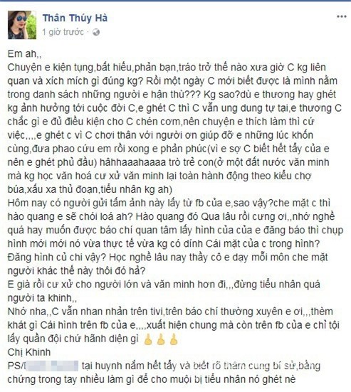 Mới đây, Thân Thúy Hà bức xúc chia sẻ status: "Em à, chuyện em kiện tụng, bất hiếu, phản bạn, tráo trở thế nào xưa giờ chị không liên quan và xích mích gì đúng không? Rồi một ngày chị mới biết được là mình nằm trong danh sách những người em hận thù? Không sao? Dù em thương hay ghét không ảnh hưởng tới cuộc đời chị. Em ghét chị thì chị vẫn ung dung tự tại. Em thương chị chắc gì em đủ điều kiện cho chị chén cơm, nên chuyện em, thích làm thì cứ việc. Em ghét chị vì chị chơi thân với người ơn giúp đỡ em những lúc khốn cùng, đưa phao cứu em rồi xong em phản phúc (vì em sợ chị biết hết tẩy của em nên em ghét phủ đầu). Trò trẻ con (ở một đất nước văn minh mà không học văn hoá cư xử văn minh lại toàn hành động theo kiểu chợ búa, xấu xa thủ đoạn, tiểu nhân không à).