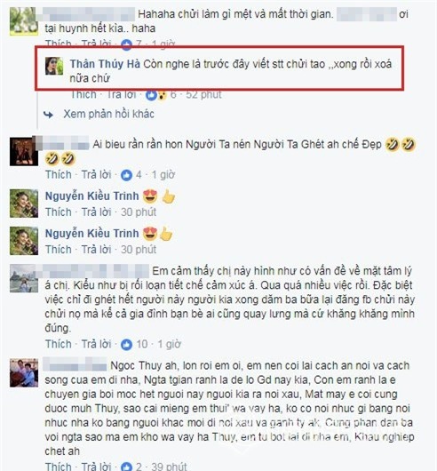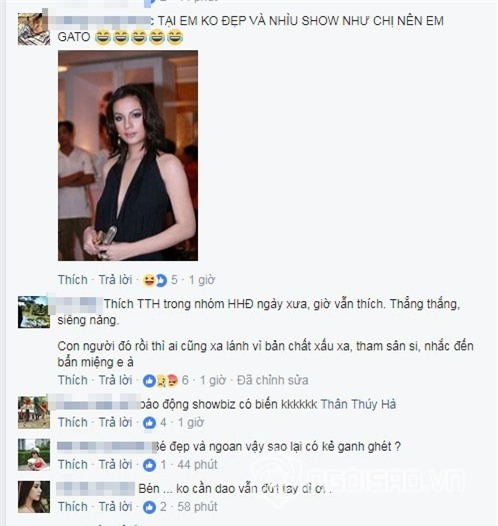 Em già rồi cư xử cho người lớn và văn minh hơn đi, đừng tiểu nhân quá người ta khinh. Nhớ nha, chị vẫn nhan nhản trên tivi, trên báo chí thường xuyên em ơi, thèm khát gì cái hình trên facebook của em, xuất hiện chung mà còn trên facebook của em chỉ tội lấy quần đội chứ hãnh diện gì. Chị khinh".