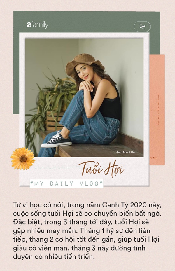 Tử vi học có nói, trong năm Canh Tý 2020 này, cuộc sống tuổi Hợi sẽ có chuyển biến bất ngờ. Đặc biệt, trong 3 tháng tới đây, tuổi Hợi sẽ gặp nhiều may mắn. Tháng 1 hỷ sự đến liên tiếp, tháng 2 cơ hội tốt đến gần, giúp tuổi Hợi giàu có viên mãn, tháng 3 này đường tình duyên có nhiều tiến triển. Nhìn chung, năm 2020 sẽ là một năm đáng mong chờ với tuổi Hợi, chẳng may có gặp phải khó khăn sóng gió cũng vượt qua ngoạn mục khiến ai cũng ngưỡng mộ. Người tuổi Hợi trọng tình hơn tiền, nhưng đa số họ đều được tận hưởng cả hai.