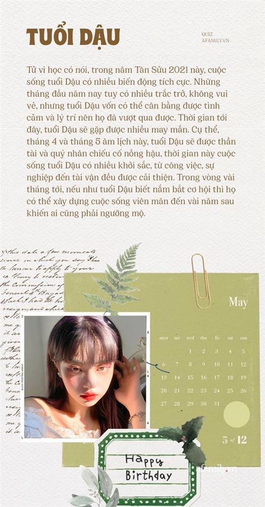 Tử vi học có nói, trong năm Tân Sửu 2021 này, cuộc sống tuổi Dậu có nhiều biến động tích cực. Những tháng đầu năm nay tuy có nhiều trắc trở, không vui vẻ, nhưng tuổi Dậu vốn có thể cân bằng được tình cảm và lý trí nên họ đã vượt qua được. Thời gian tới đây, tuổi Dậu sẽ gặp được nhiều may mắn. Cụ thể, tháng 4 và tháng 5 âm lịch này, tuổi Dậu sẽ được thần tài và quý nhân chiếu cố nồng hậu, thời gian này cuộc sống tuổi Dậu có nhiều khởi sắc, từ công việc, sự nghiệp đến tài vận đều được cải thiện. Trong vòng vài tháng tới, nếu như tuổi Dậu biết nắm bắt cơ hội thì họ có thể xây dựng cuộc sống viên mãn đến vài năm sau khiến ai cũng phải ngưỡng mộ.