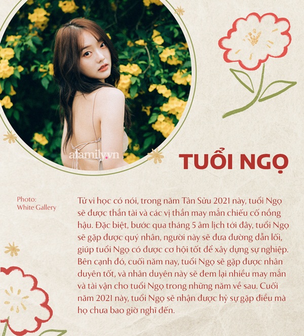 Tử vi học có nói, trong năm Tân Sửu 2021 này, tuổi Ngọ sẽ được thần tài và các vị thần may mắn chiếu cố nồng hậu. Đặc biệt, bước qua tháng 5 âm lịch tới đây, tuổi Ngọ sẽ gặp được quý nhân, người này sẽ đưa đường dẫn lối, giúp tuổi Ngọ có được cơ hội tốt để xây dựng sự nghiệp. Bên cạnh đó, cuối năm nay, tuổi Ngọ sẽ gặp được nhân duyên tốt, và nhân duyên này sẽ đem lại nhiều may mắn và tài vận cho tuổi Ngọ trong những năm về sau. Cuối năm 2021 này, tuổi Ngọ sẽ nhận được hỷ sự gặp điều mà họ chưa bao giờ nghĩ đến.