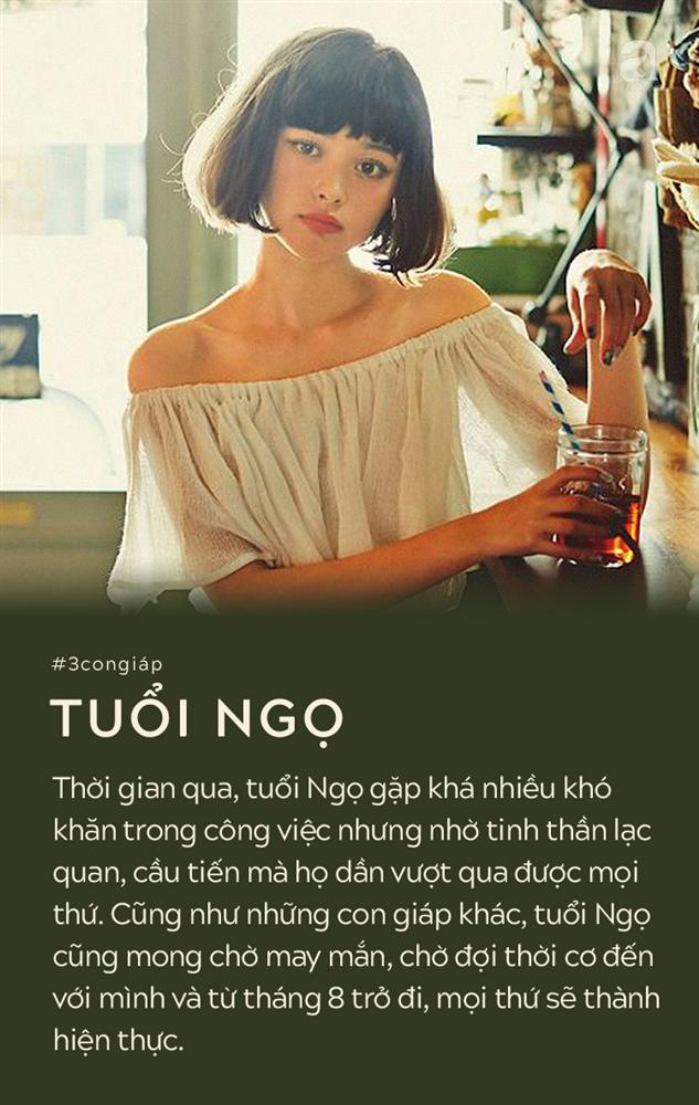 Trời sinh tuổi Ngọ vốn là những người thích tự do bay nhảy, phóng khoáng và thoải mái sáng tạo. Bề ngoài trông họ có vẻ không nghiêm túc nhưng bên trong lại rất có trách nhiệm với công việc của mình. Thời gian qua, tuổi Ngọ gặp khá nhiều khó khăn trong công việc nhưng nhờ tinh thần lạc quan, cầu tiến mà họ dần vượt qua được mọi thứ. Cũng như những con giáp khác, tuổi Ngọ cũng mong chờ may mắn, chờ đợi thời cơ đến với mình và từ tháng 8 trở đi, mọi thứ sẽ thành hiện thực. Cụ thể, vào 2-3 tháng tới, tuổi Ngọ sẽ có bước chuyển mình trong công việc, đây là thời điểm quan trọng nhất, nếu như biết nắm bắt cơ hội thì cuộc sống sẽ thăng hoa rực rỡ, tài vận đến ào ạt không kịp đỡ. Dự kiến cuối năm, tuổi Ngọ cá kiếm được tài sản to lớn.