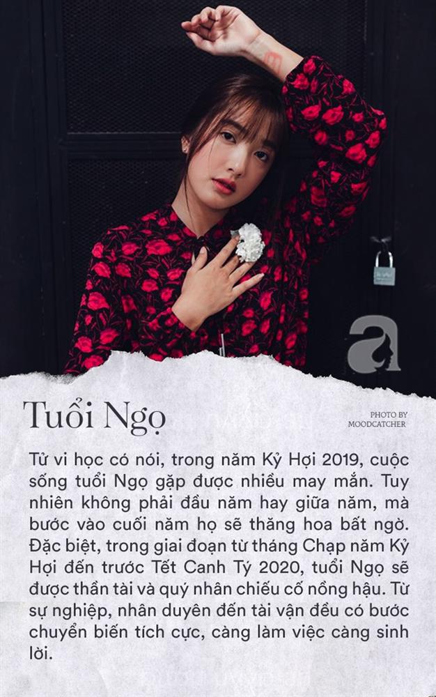Tử vi học có nói, trong năm Kỷ Hợi 2019, cuộc sống tuổi Ngọ gặp được nhiều may mắn. Tuy nhiên không phải đầu năm hay giữa năm, mà bước vào cuối năm họ sẽ thăng hoa bất ngờ. Đặc biệt, trong giai đoạn từ tháng Chạp năm Kỷ Hợi đến trước Tết Canh Tý 2020, tuổi Ngọ sẽ được thần tài và quý nhân chiếu cố nồng hậu. Từ sự nghiệp, nhân duyên đến tài vận đều có bước chuyển biến tích cực, càng làm việc càng sinh lời. Người tuổi Ngọ có tính cách tinh tế, một khi gặp được thời cơ thuận lợi, họ sẽ dễ dàng nắm bắt được cơ hội tốt để đổi đời. Nhìn chung, từ sau năm 2020, cuộc sống tuổi Ngọ sẽ đặc biệt viên mãn.