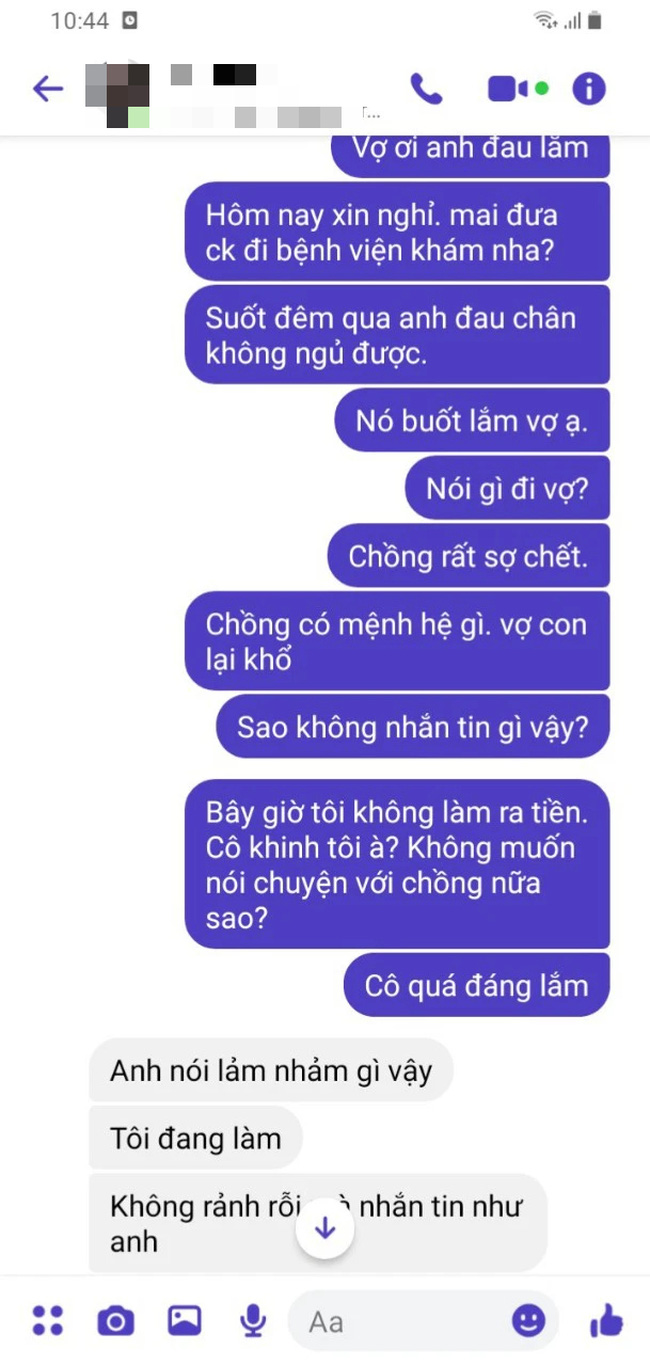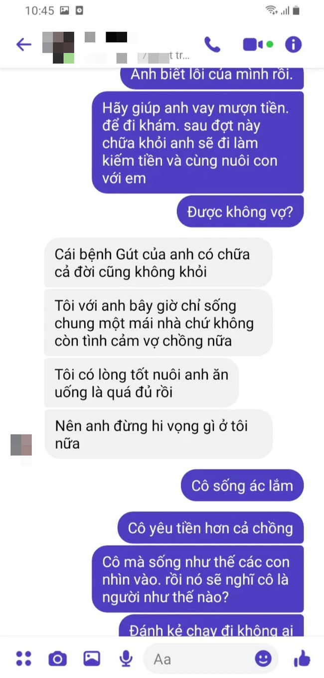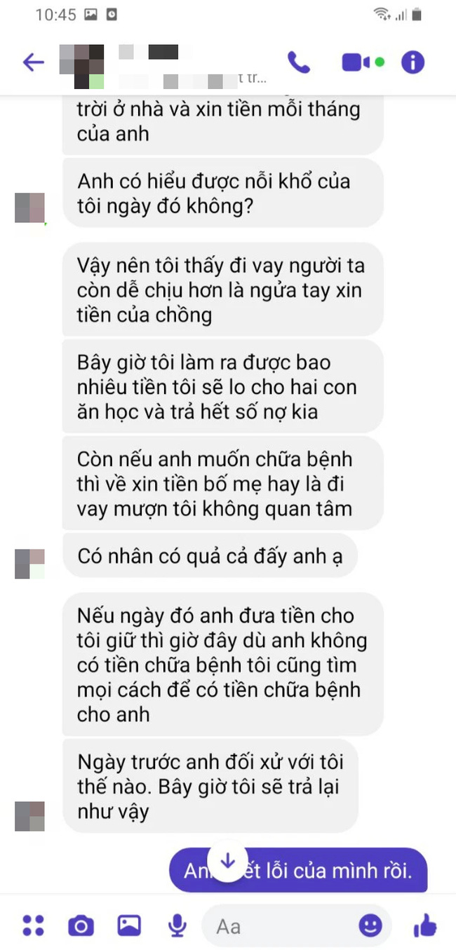 Tôi biết mình có lỗi với vợ con rất nhiều nhưng khi tôi bị bệnh tật hành hạ, cô ấy không thể bỏ rơi chồng lúc này được. Tôi rất muốn vợ bỏ tiền ra chữa bệnh nhưng cô ấy không chịu. Mọi người đọc đoạn tin nhắn mà tôi gửi dưới đây, xem thái độ của vợ tôi như thế là có ý gì?