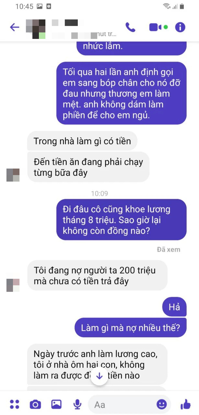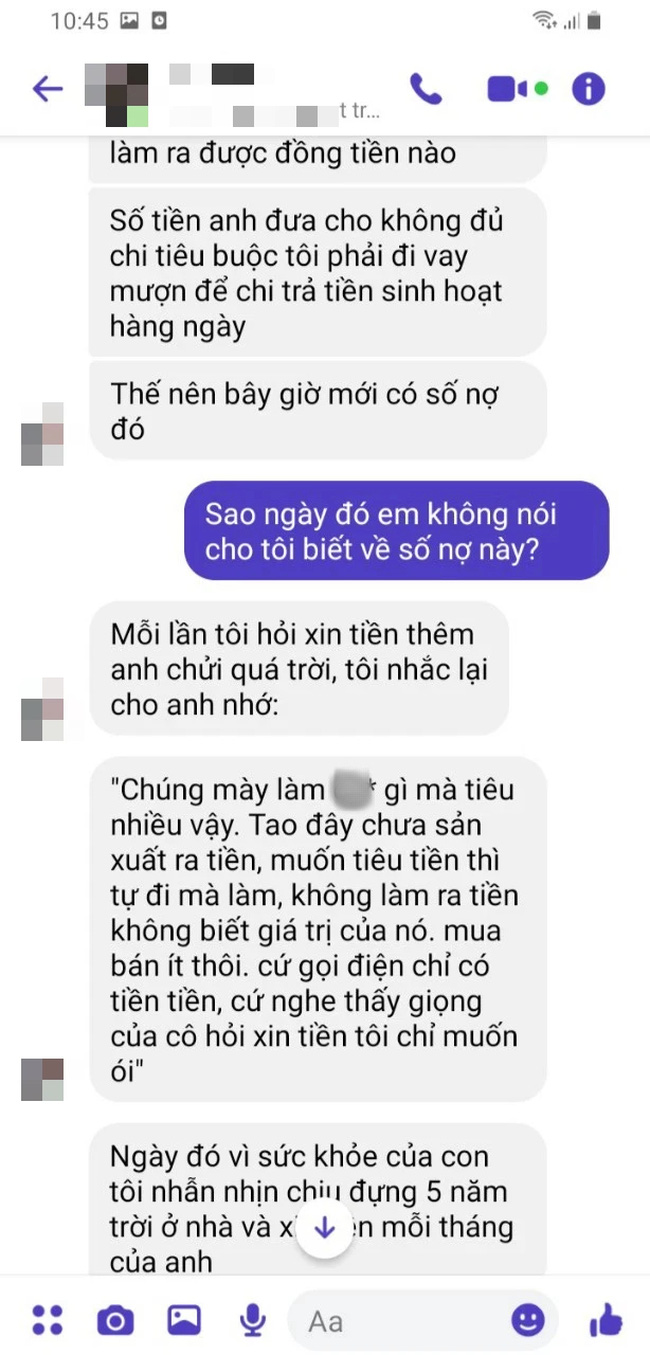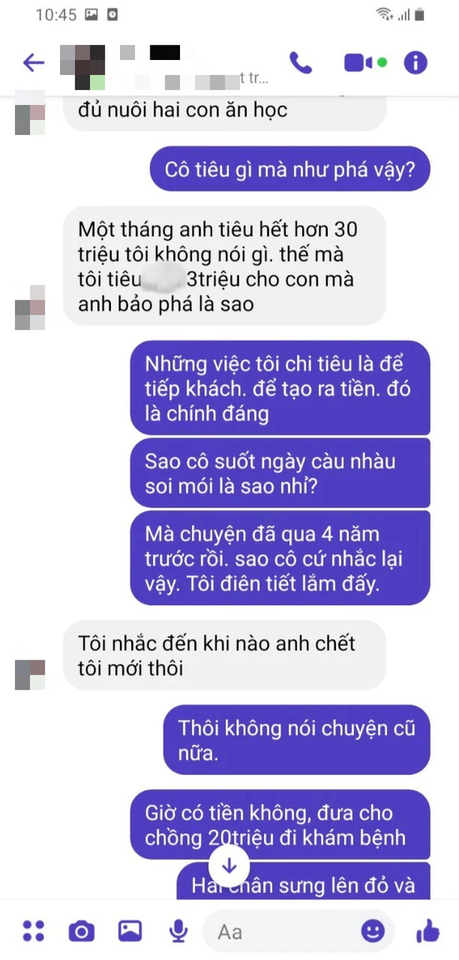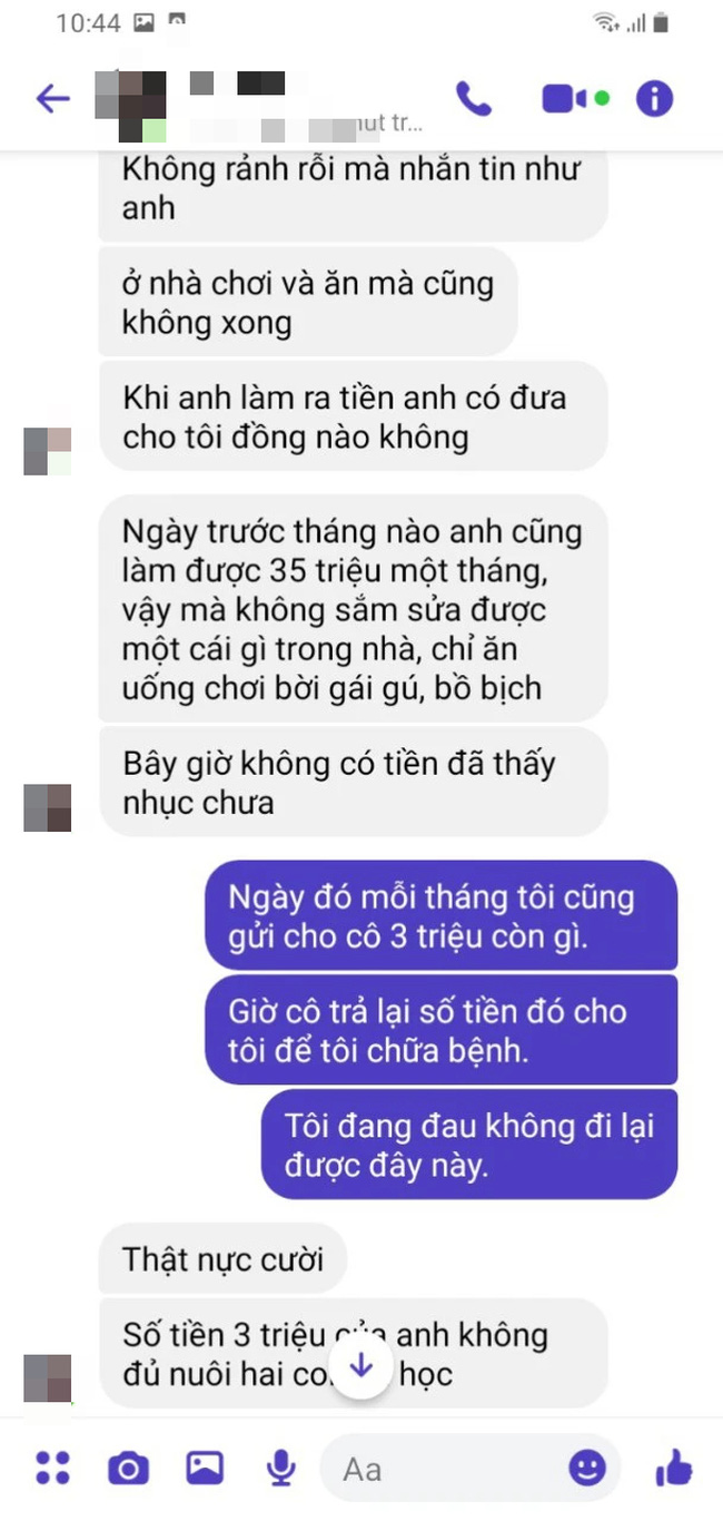 Tôi biết mình có lỗi với vợ con rất nhiều nhưng khi tôi bị bệnh tật hành hạ, cô ấy không thể bỏ rơi chồng lúc này được. Tôi rất muốn vợ bỏ tiền ra chữa bệnh nhưng cô ấy không chịu. Mọi người đọc đoạn tin nhắn mà tôi gửi dưới đây, xem thái độ của vợ tôi như thế là có ý gì?