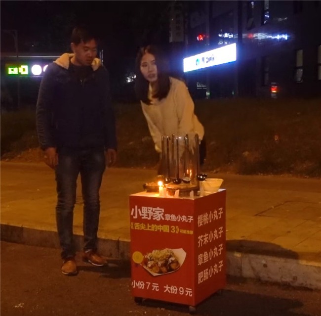 Nhưng phần hấp dẫn nhất lại nằm ở chỗ này đây. Sau khi đúc bánh xong, Tiểu Dã không chỉ tự mình thưởng thức và chia nó cho đồng nghiệp. Cô bạn còn nghĩ ra cách biến món ăn này thành một cơ hội để kinh doanh. Chính xác là nàng ta nghĩ ra kế đẩy xe hàng rong bán bánh Takoyaki dạo!