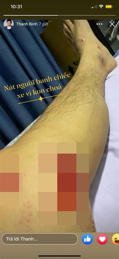 Chân của Thanh Bình bị chảy máu, trầy xước nặng sau tai nạn bất ngờ. Theo nam diễn viên chiếc motor của anh cũng gặp hư hỏng.
