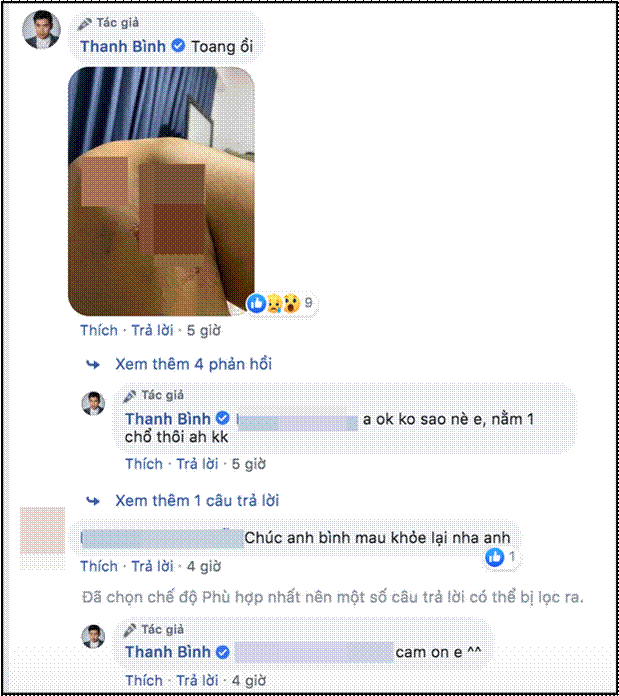 Thanh Bình cho biết anh bị tai nạn bất ngờ và hiện tại phải nằm một chỗ vì chân bị chảy máu, trầy xước khá nặng.