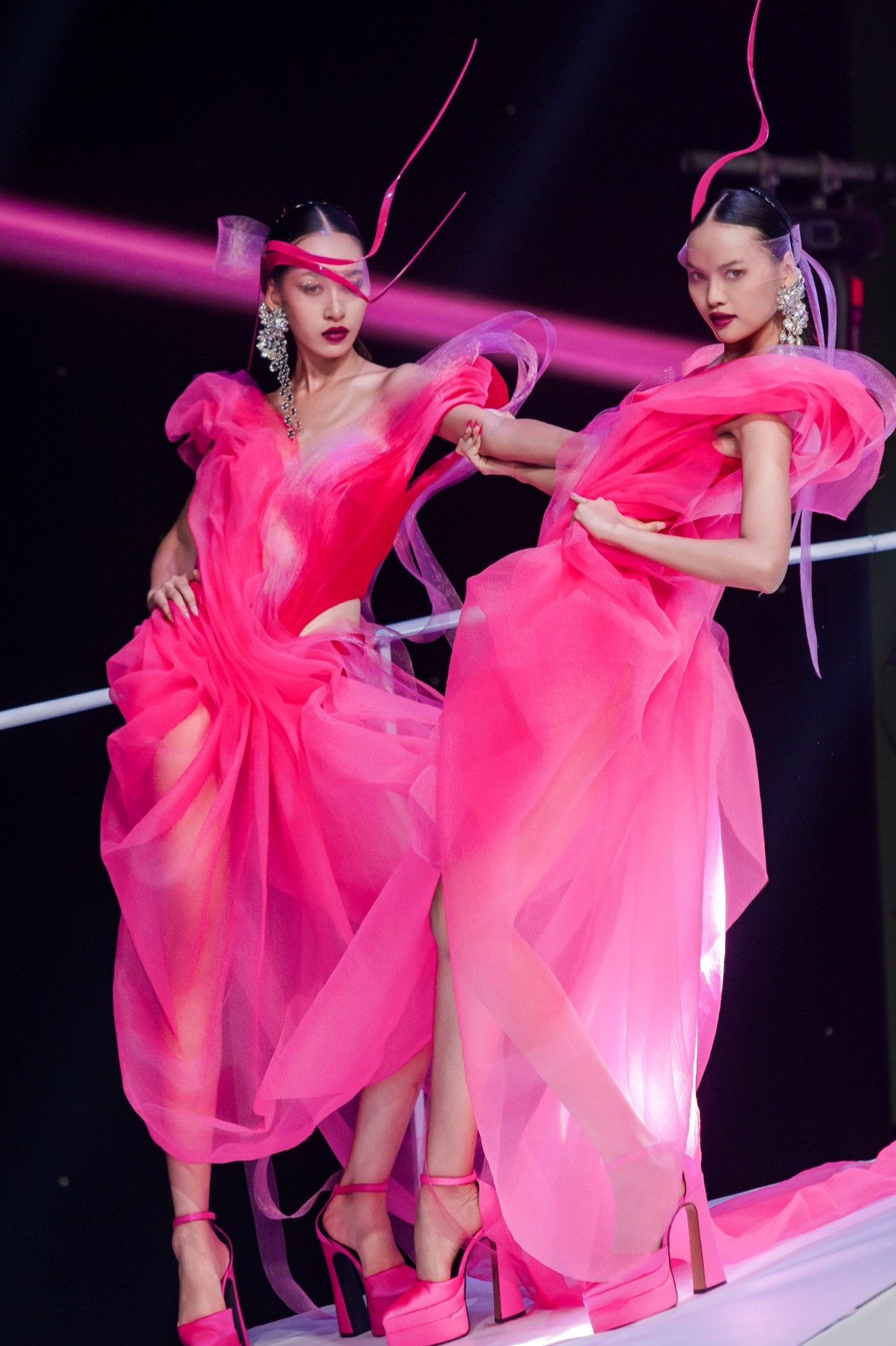 Ngược lại, Giang Phùng gây ấn tượng mạnh với bước đi chắc chắn, biểu cảm tự tin và cách xử lý trang phục khéo léo. Bộ đôi Mai Hoa - Tuyết Mai phối hợp ăn ý, mang đến phần thi đầy trọn vẹn. Một số thí sinh còn liều lĩnh catwalk giật lùi để tạo dấu ấn riêng.